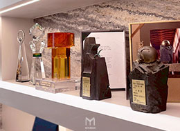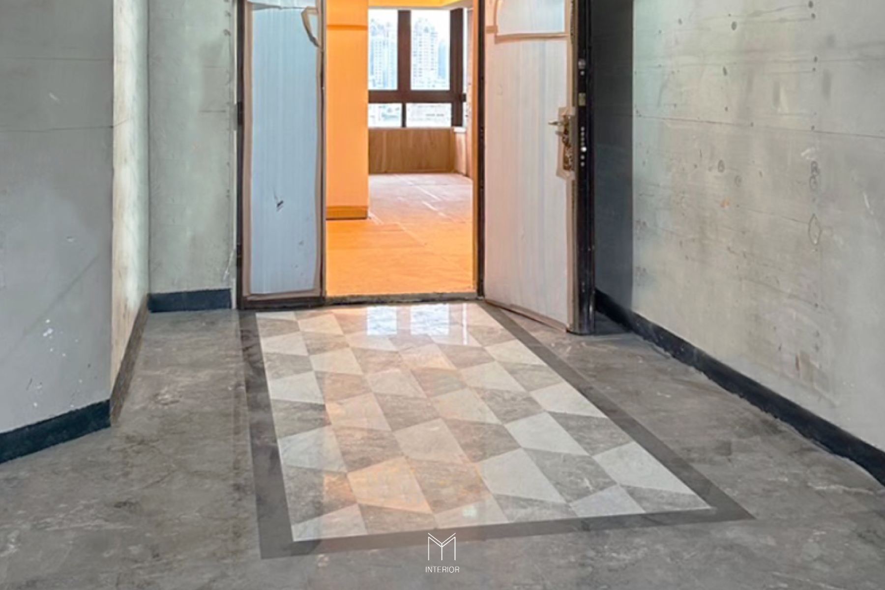 運用懸浮式金屬鏤空屏風、大理石、木皮與鏡面等異材質,